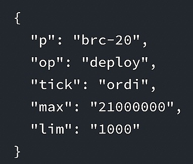 这是Ordi的代币部署铭文信息,就是将这个内容刻录到聪上,这笔交易被打包就完成了铭文的部署。这里“p”,规定了是BRC-20,“op”是行为类型,这里Deploy是部署,另外其他的有“Mint”铸造、“Transfer”转移。“max”就是代币的总量。“lim”就是一张铭文包含的代币最大的数量。