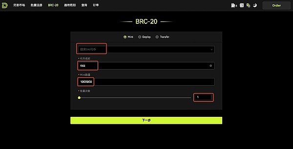 3.跳转到BRC-20铸造页面,填写需要铸造代币的名称、单张铭文包含的代币的数量(默认最大)以及张数