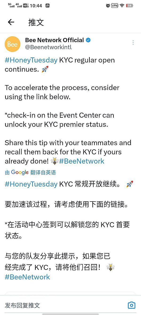 bee network利好不断,还在签到的矿工,迅速召回你的好友,kyc持续认证中,近期将会实现支付内转或者是上所计划,更多利好关注官方推特!