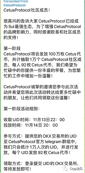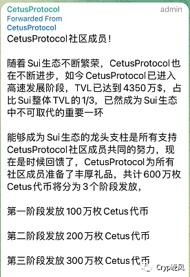 目前Cetus正在进行系列空投活动,官方表示此次将拿出数百万枚Cetus作为空投奖励