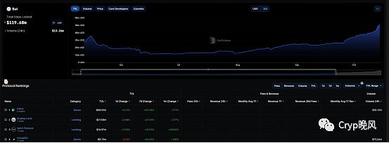 作为新生力量,Sui 生态目前还处在起步阶段。根据 DefiLlama 数据,2023 年 11 月 Sui 总 TVL 为1.1亿美元左右,其生态项目也以DEX和跨链类为主。这主要面临以下瓶颈: