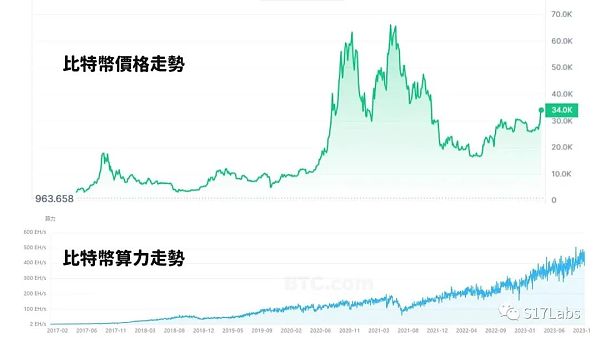 但我们看一下两者走势对比,算力虽然偶尔会下跌,但整体而言趋势持续向上,跟价格走势并没有太明显的连动。
