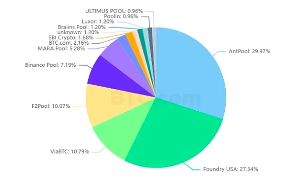 多数矿工也会合作组成矿池一起挖矿,根据BTC.com 数据,目前前五大矿池合计已经超过比特币全网85% 算力。