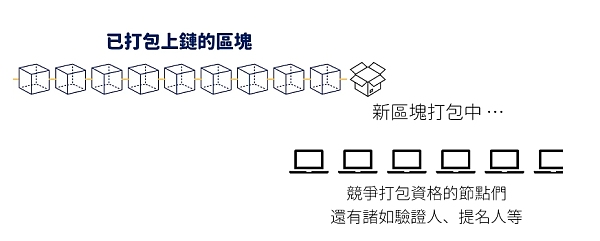 比特币采取的方式是POW (工作量证明),程式会出一题数学题,题目很难需要算很久,所有想参与挖矿的赶紧计算,由第一个算出正确答案的获得这次打包区块的权利。