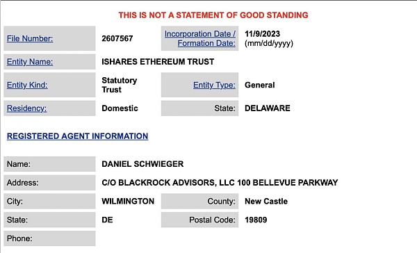 11月9日,贝莱德在特拉华州注册以太坊信托(iShares Ethereum Trust),彭博分析师Eric Balchunas 对此确认称,贝莱德已向申请以太币现货 ETF 迈出了第一步。