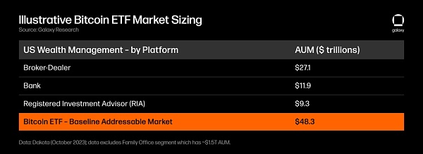 目前加密货币总市值为 1.4万亿美元,而根据 Galaxy Digital 的研究报告,美国财富管理行业的资金规模为 48.3万亿美元,假如千分之一的资金量进入到比特币市场,就将 BTC 的价格带上一个新的高度。