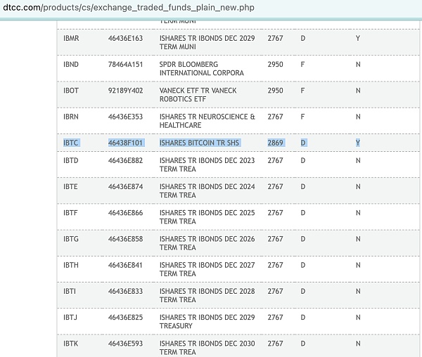 10月24日,彭博高级 ETF 分析师 Eric Balchunas 发推称,贝莱德的比特币现货ETF已在美国证券存托清算公司(DTCC),股票代码为 IBTC,这是比特币现货 ETF上市的一个环节,也只是准备流程中的一部分,并不代表贝莱德的现货比特币 ETF 申请已通过。