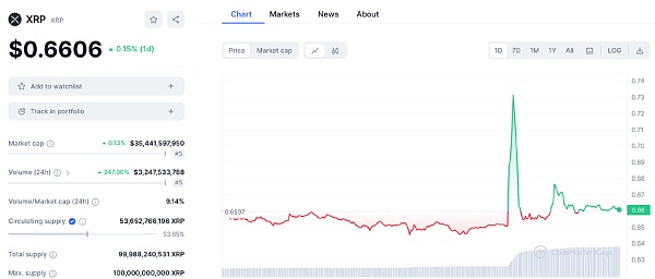 但随后贝莱德的一名发言人明确表示,该文件是虚假信息,与贝莱德无关,贝莱德无计划推出 XRP 现货 ETF,然后 XRP 价格迅速下跌,目前为 0.66美元,已回吐此前的涨幅。