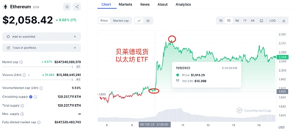 受此利好消息的影响,仅仅经过半天的时间(11月9日晚8点左右 --- 11月10日上午8点左右)ETH 的价格就从 1900美元被爆拉到 2100 美元以上,涨幅达到了 10% 以上。
