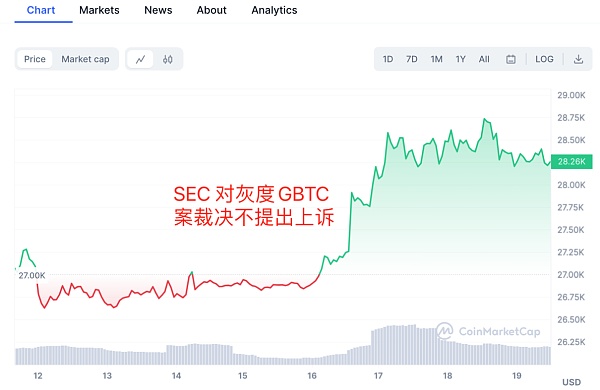 另外,在美国SEC对灰度GBTC案裁决提出上诉的最后期限,SEC决定不提出上诉的消息,也把BTC 的价格拉升了6个百分点。