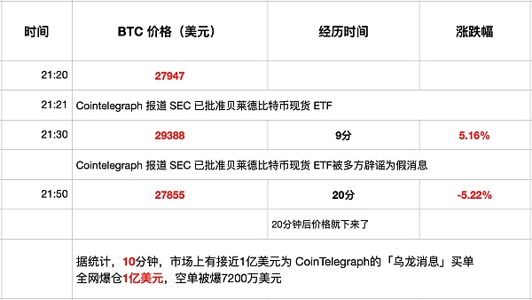 随后,Cointelegraph 发布的消息被辟谣,BTC 的价格又瞬间从 3万多美元跌落到了 27000 多美元,回吐了之前因假消息带来的所有涨幅。