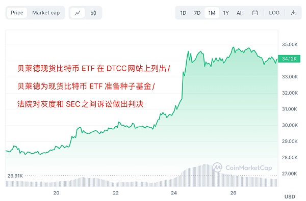 在贝莱德、富达等资管巨头的引领下,华尔街资管巨头们纷纷向 SEC 提交了现货比特币 ETF 的申请,BTC 价格从 2.5万美元被暴拉到 3万美元以上。