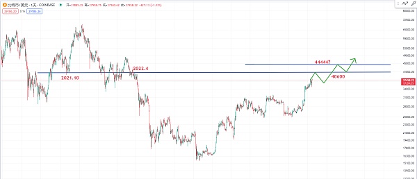 在比特币涨至48000之前,我们要如何判断短期的压力位?通常一些整数位会有压力,或者在40600美元附近也可能出现短期整理的区间。这个位置是2022年4月份的关键位置,也是在2021年10月份的位置,当时低点的位置构成了支撑位转阻力位。