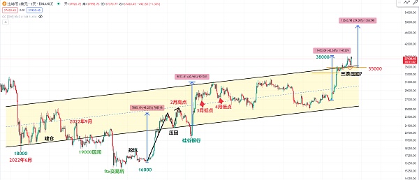 我们可以观察比特币的日线图,特别是35000的支撑位。根据个人的杠杆倍数,选择止损的百分比也会不同。一般来说,十倍杠杆下,1%的止损是相对适中的。所以35000的支撑位是一个巧妙的位置,取决于你选择的高点和中轴位置,比如今年3月份的低点、几年4月份的低点、硅谷银行的高点等。这些位置构成了一个明显的支撑位。