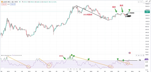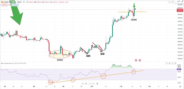 RSI指标在趋势突破和支撑位上往往有领先反应的特点。观察比特币在25000起涨的位置后的反弹,可以看到在25500的位置有一个买入机会。同样,在35000位置附近也有买入机会。如果你做对了,可以将止损位设置在成本位,或者修正止盈位。