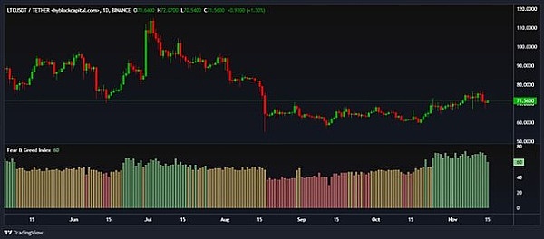 根据CoinMarketCap的数据,莱特币的交易价格为71.54美元,过去24小时内略有下跌。然而,根据Hyblock Capital的数据分析,市场普遍看涨,显示出一种贪婪的情绪。这种情绪往往会在短期内提高资产的价值。