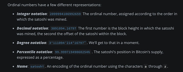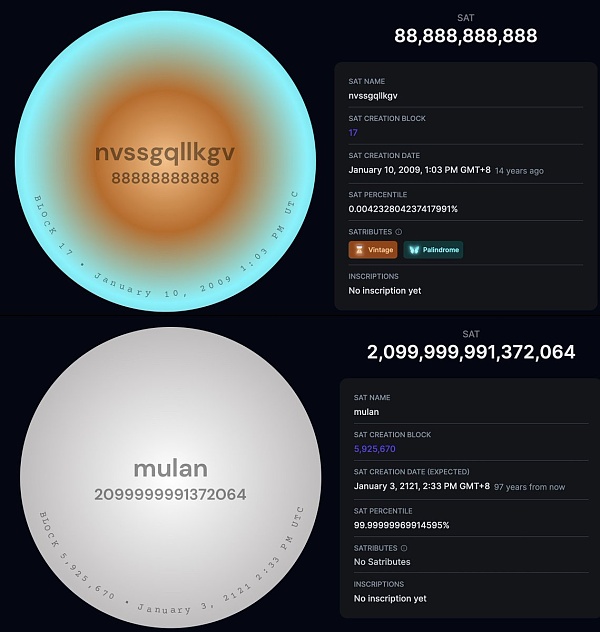Ordinals 的独特之处在于文件被铭刻在聪上(类似于“美分”相对于美元,聪是一个比特币的最小计量单位,一聪等于一亿分之一个 BTC )。 每个聪都有一个编号(ID)和文本名称(下图展示了一些很酷的聪)。