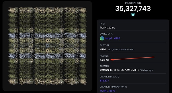 此外,我们还在文件大小和加载速度的优化上面做出了努力。我们结合了两种技术:预生成和运行时构建艺术。 每件艺术品在预生成期间都被随机分配了图形,然后在其铭刻的时候才会将其加载到浏览器中,我们使用递归铭文和 JS 来构建艺术品。 这使得每个艺术品的大小平均只有 3-4KB。