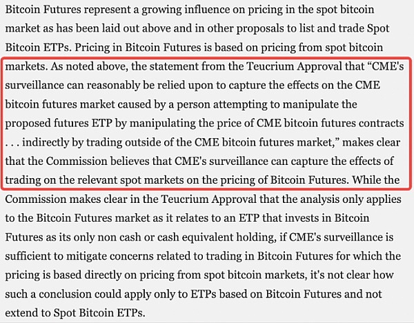 从 SEC 审批期货 ETF 来看,其不可能不承认 CME 是一个「规模较大的受监管市场」,因此更重要的原因应该是 CME 交易的是比 BTC 期货而不是 BTC 现货,因此无法监控和保护 BTC 现货。