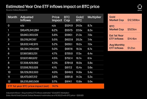 据 Galaxy 的报告统计,通过估算当前美国资管的管理规模,预计在 BTC ETF 推出的第一年后,资金流入将达到 140 亿美元,第二年增至 265 亿美元,第三年增至 386 亿美元。同时,通过与黄金的价格变化对比,预计 ETF 推出的第一年 BTC 将上涨 74%。