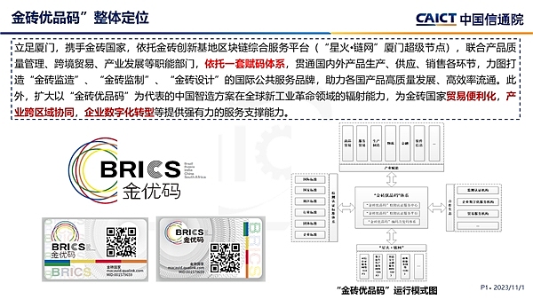 发展定位:“金砖优品码”基于金砖创新基地区块链综合服务平台(“星火•链网”超级节点(厦门)),通过一套标准化赋码体系贯通国内外全产业环节,推进数据要素跨系统、跨企业、跨行业、跨地域共享,形成“筑牢数字底座、构建检测认证标准体系、建设合作服务生态、数据赋能产业发展”发展模式,打造标准化、国际化、数智化的检测认证标准公共服务品牌,助力各国产品高质量发展及高效率流通。