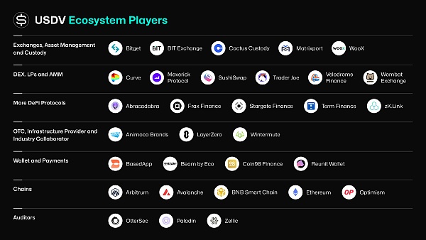 其中,Verified USD 基金会是生态主要推动者和支持者,最大的使命在于培育一个由贡献者组成的进步社区。此外,Matrixport、LayerZero 等关键贡献者也在生态建设中扮演者不可或缺的角色,他们与 Curve、Sushi、TraderJoe、Stargate 等重要的 DeFi 设施一起,为共同合作壮大稳定币的生态规模而努力。