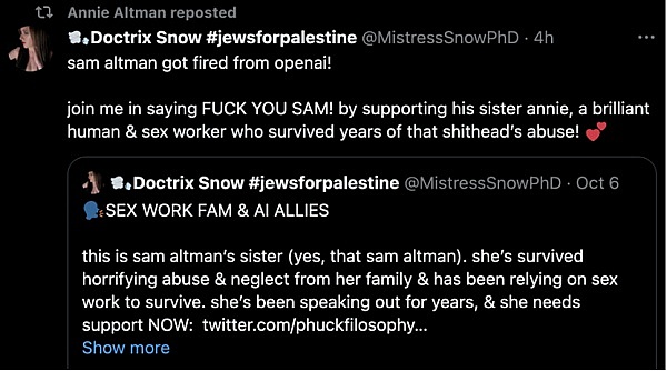 你以为这就完了?就在OpenAI发公告的同时,有信息爆料称奥尔特曼的亲妹妹安妮,早在2021年就曾在网上说自己遭受了哥哥的虐待,包括性虐待、精神虐待、语言虐待等等。据公开资料显示,奥尔特曼家中有四个兄弟姐妹,他是老大,下面有两个弟弟麦克斯和杰克,妹妹安妮比最大的哥哥小九岁。随着奥尔特曼的被踹,安妮也在X上发文庆贺:奥尔特曼被OpenAI解雇了!和我一起说去**的山姆!请支持他的妹妹安妮,这是一位才华横溢的人类和性工作者,在**的虐待下幸存下来!