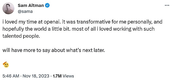 就在刚刚过去的这个早晨,OpenAI于官网宣布领导层换届,原CEO山姆·奥尔特曼被免去CEO职务并离开董事会和公司。该决策立即生效,此时距离奥尔特曼主持OpenAI开发者大会才刚刚过去十多天。OpenAI的公告表示,奥尔特曼的离开是董事会经过审议后得出的结论,由于他在与董事会的沟通中始终不坦诚,阻碍了董事会履行职责的能力,董事会不再相信他有能力继续领导OpenAI。公告发出后奥尔特曼于社交平台X(前推特)上发文:“我很喜欢在OpenAI的时光。它改变了我,也也希望改变一点世界。最重要的是,我喜欢与这些才华横溢的人共事。关于未来,我稍后会有更多发言。”