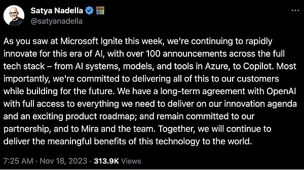 同时,微软CEO纳德拉也发了一篇长文,但出人意料的只字未提奥尔特曼。他只是强调,微软与OpenAI签订了长期协议,并且会致力于保持合作伙伴关系,继续为世界带来积极、有益的AI技术。