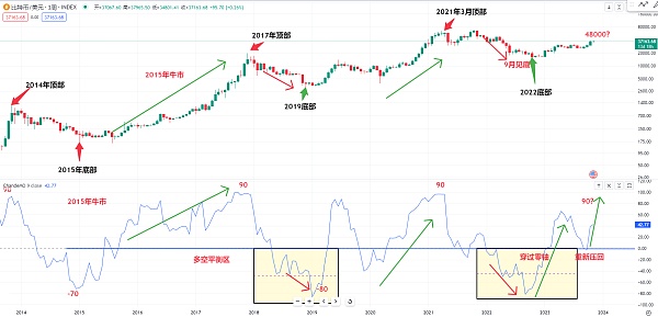 目前的比特币CMO指标已经突破了零轴,并且一直维持在零轴上方,这意味着目前是一个重要的牛市。历史上比特币牛市的结构也都是在零轴上方,包括2015年的大牛市。因此,目前没有必要怀疑比特币的牛市趋势,后面还有可能涨到更高的位置。