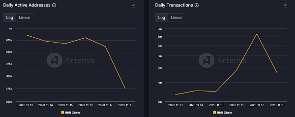 但当AMBCrypto查看Artemis的数据时,我们发现BNB Chain的每日活跃地址上周实际上出现了下降。在 11 月 17 日大幅飙升之后,区块链的每日交易量大幅下降。
