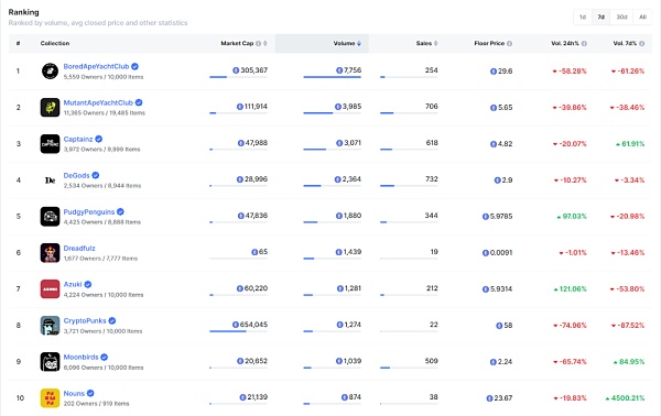 Ethereum 网络上最热门、交易量最高的 Top 10 NFT 项目如下图所示: