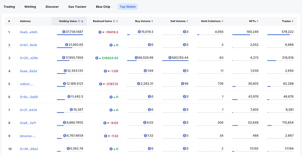 NFTScan 对排名前 1000 的 NFT 持仓价值钱包地址进行了分析,当前持有价值排名前 10 如下图所示: