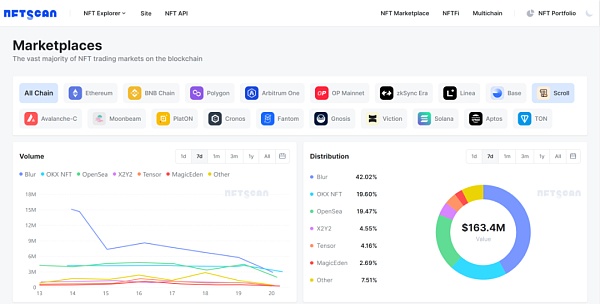 本周:大部分交易市场走势较为起伏,整体交易额在 11 月 14 日达到最高,Blur 市场最高达 15M 美元,NFTScan 收录 195 个交易市场 7d 总交易额 $163.4m,较上周有 $70m 下降($232.2m),本周 Blur 交易额排名第一,市场交易额分布较稳定,排名前六的交易市场及占比分布: