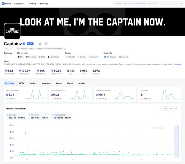 Captainz 是 Memeland 旗下生态项目,Captainz NFTs 的铸造价格是 1.069e,Captainz 上周交易额为 3,075e,地板价稳定在 4.82e 左右,排名第三,7d 交易额增幅达 61.91%。