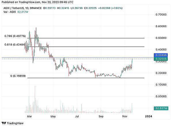 今年初以来,人工智能加密项目迎来了强劲的上升趋势,其中奇点网(AGIX)表现惊人,涨幅达到了100%。从10月20日的双底开始的第一次爆发之后是一些横盘整理,然后才是目前正在经历的上涨。目前阻力位于0.33美元附近,而0.618斐波那契水平位于0.42美元。