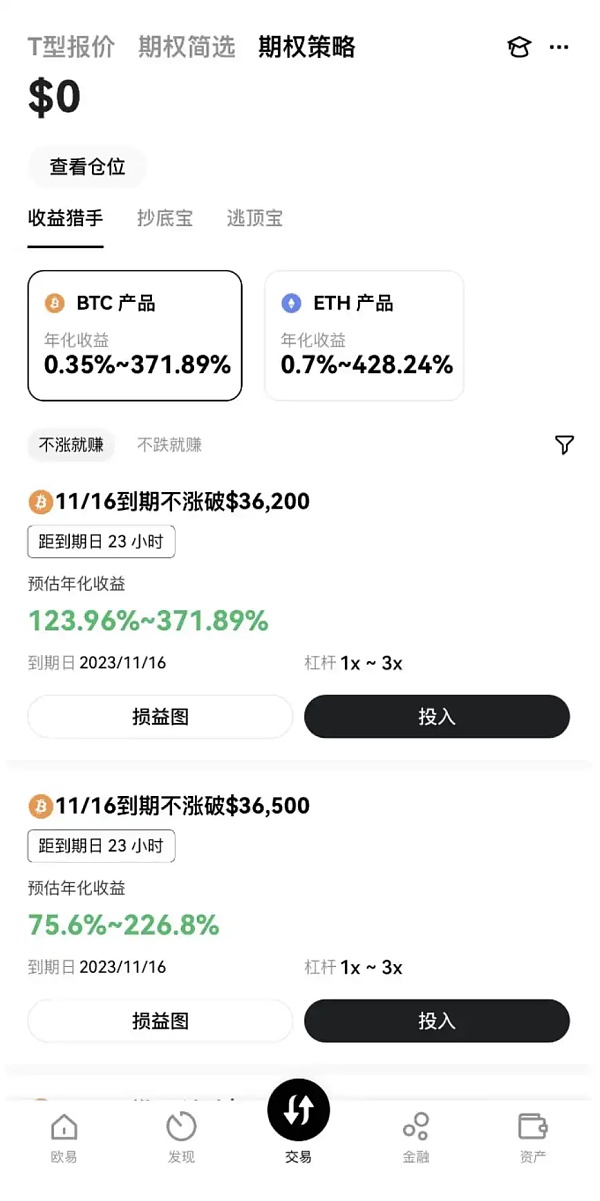 针对上述痛点,11 月 15 日,OKX 宣布上线基于期权构建的全新产品——收益猎手。产品整体风格上,通过简单明了的图形化收益曲线降低用户理解门槛;交易体验上,通过简化期权卖方的下单流程并以年化形式展示收益,降低用户参与门槛,让新手用户也能轻松赚取高额年化收益。
