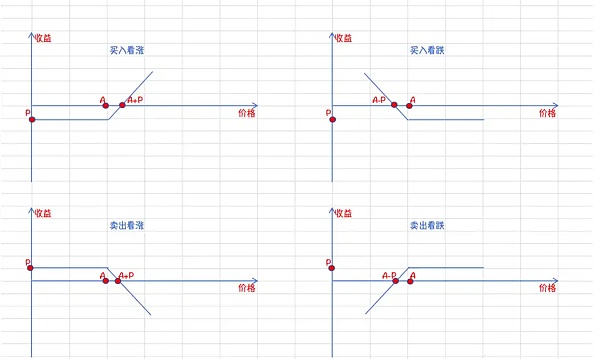 结合以下草图来,简单分析一下四种单式策略,及其风险与收益。其中,横坐标为标的的价格,纵坐标为收益,A 为行权价格,P 为权利金。以买入看涨期权为例,假如张三以权利金 P 买入了行权价为 A 的 BTC 看涨期权,即意味着到日期,张三有权以 A 的价格买入 BTC。