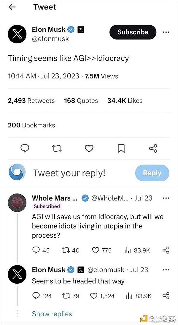 今天马斯克还提到了AGI,马斯克也在担忧AGI的提前到来。