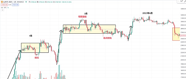 我们可以回顾一下比特币在今年1月份的这一波拉升 我们可以看一下他在这里的箱体也是有几个低点的位置挖坑 就是我们看到如果他有往上突破的话 你到时候就要去观察一下有没有量能 如果没有量能的情况下我们就不要去追
