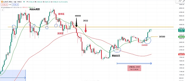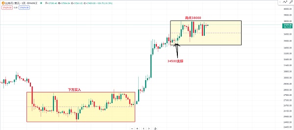 然后我们再观察一下比特币日线的这张图表 因为我有判断有可能很重要的一个支撑位 就是这两根K线低点的位置 大约是在34500 然后高点38000 所以我们需要给主力一点空间 他如果涨多了就需要洗盘 有一点是下方买入的利润是非常的多 在这个位置他就需要空间来洗盘