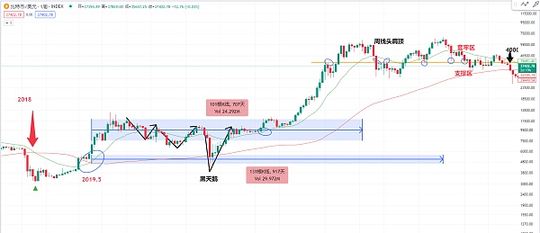 同时也是比特币在2021年这个顶部的位置 感觉有一个非常明显的头肩顶结构 当时是在这几个低点 然后在2021年5到7月份这几个高点的位置 以及比特币在2021年的1月份左右 当时是有预期美联储要开始加息 就是这边有一个回撤 他是在4万附近这边有一道非常重要的压力位关卡