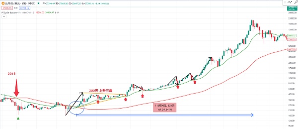 所以我们再回顾一下 我们一直都在预期比特币的牛市很像2015年底部起来之后这边上涨往上突破 后面这边是盘整了一个上升三角200天 那我们可以看一下他后面牛市每一波往上突破又压回来这条绿色的线