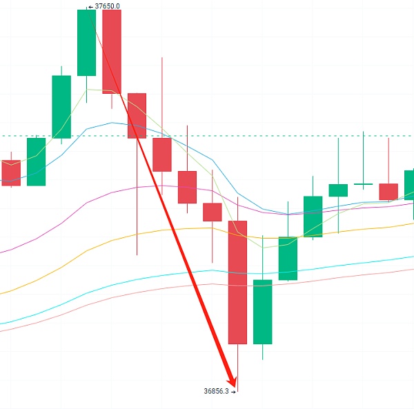 大盘弱势调整,还记得我重点说过的点位,接下来要重点关注的是35800附近位置,如果4小时级别重新下跌到35800附近,那么我们要高度重视,短期趋势破坏,到时候行情会继续试探底部的支撑位置,到时候再说支撑位置在哪里,同时我也会在不忙的时候更新技术指标视频,现货合约的朋友都可以来看看。