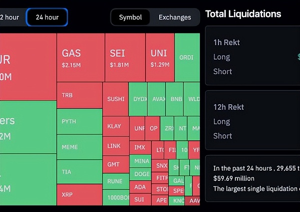 据Coinglass数据,过去24 小时有29,655 名投资者遭清算,比特币共爆仓超1,472 万美元居冠、以太坊爆仓超 969 万美元次之…全网爆仓超5,969 万美元。