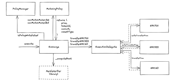 匹配成功后,交易将提交给交易所模块执行,最终由ExecutionDelegate负责完成代币的转移。值得一提的是,模糊预先设定的ERC721和ERC1155代币的限价单模式,这就构成了白名单的一部分。