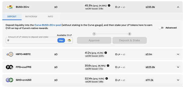 可在Curve中以BUSD、DAI、USDT、USDC中的一种或多种提供流动性,再将流动性代币质押到Convex中获得奖励。该交易对的流动性为23.6万美元,奖励主要是CRV,其余有少量CVX和交易手续费。但需注意Binance和Paxos支持BUSD的截止时间为2024年2月。