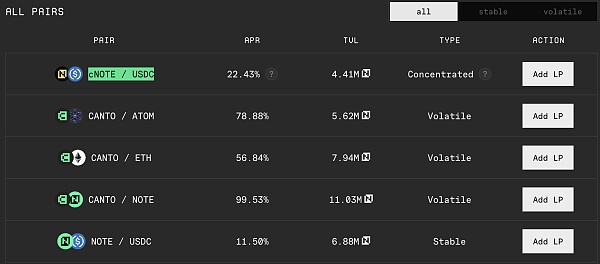 目前Canto上cNOTE/USDC交易对的流动性为441万美元,APR为22.42%。可以直接购买NOTE,进行存款获得cNOTE,和USDC一起提供流动性;或者抵押USDC或USDT自行铸造NOTE再进行后续操作。