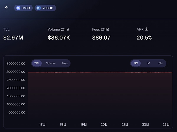 Thala的MOD/USDC池中有297万美元的流动性,APR为20.5%,但需注意获得的MOD需要一个月时间才能解锁。