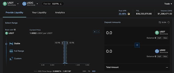 该交易对在Cetus上有3923万美元的流动性。但要注意Cetus允许集中流动性,为了获得更高收益,流动性提供者基本都将流动性集中在相对较窄的范围内,如果USDC/USDT价格波动,可能需要调整。